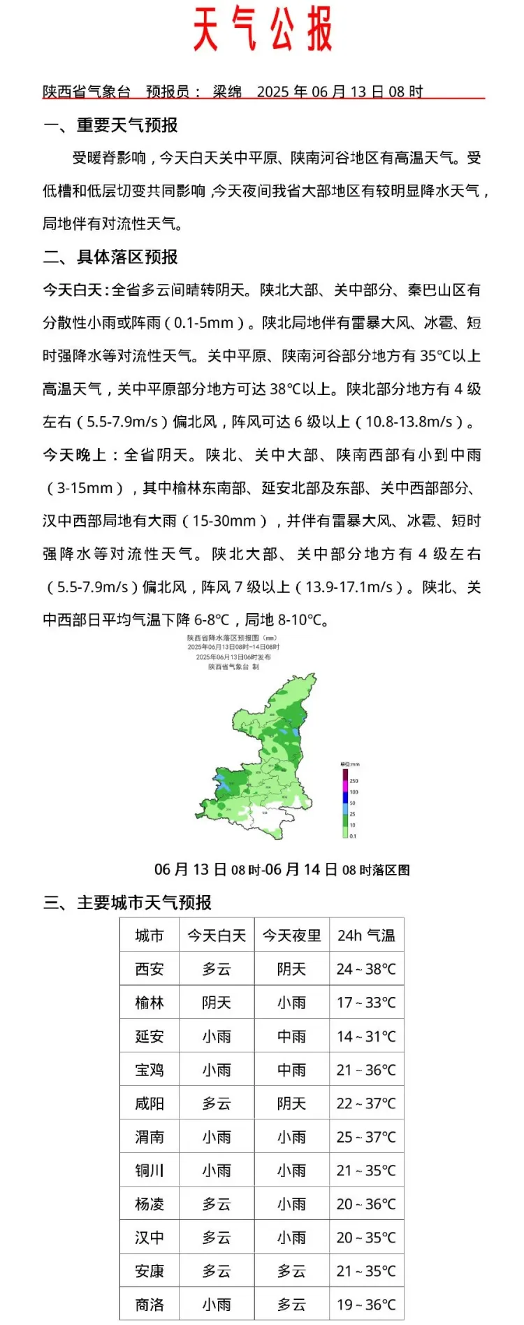 受高空槽和低层切变共同影响,预计6月13日15时至14日15时,陕北、关中北部及西部、汉中西部有雷暴天气,其中榆林南部、延安大部、铜川西部、咸阳北部、宝鸡大部、汉中西部局地有雷暴大风,阵风可达8级以上,榆林东部局地、延安北部及东部局地、咸阳北部局地、宝鸡北部局地有冰雹,榆林东部局地、延安东部及西部局地、咸阳北部局地、宝鸡北部有短时强降水。